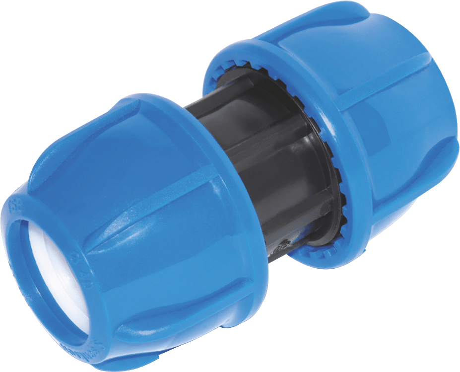 Raccord à compression de qualité supérieure utilisé pour raccorder deux tuyaux PE de même taille et même longueur l’un à l’autre.